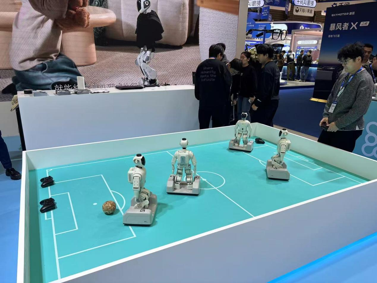 在乐享科技展台,家庭守护陪伴机器人M1通过足球赛与观众互动,协作机器人N1也忙于给观众端茶送水,成为展台新秀。