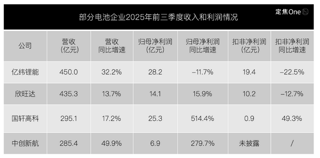 以2025年前三季度为例,被视为二线玩家中“优等生”的亿纬锂能,营收高速增长,扣非净利润却下跌超22%;国轩高科表面利润暴涨,但扣除投资奇瑞汽车的股权收益后,主营业务盈利不足1亿元;中创新航好不容易扭亏,但约6.9亿的利润规模,与行业龙头宁德时代相比有70多倍的差距。